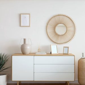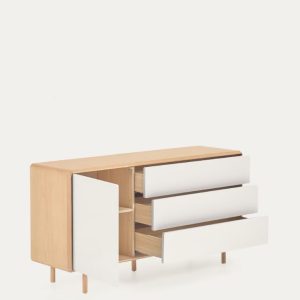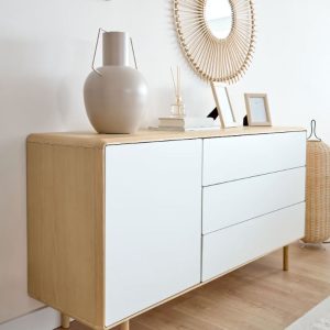 • Mueble TV de chapa de fresno con patas y bordes de madera maciza de fresno.