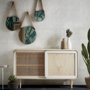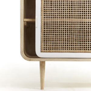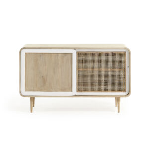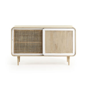 Aparador con estructura en madera de mango macizo natural y puertas correderas con detalle en caña trenzada.