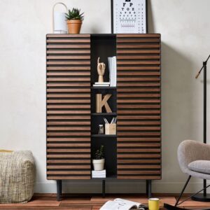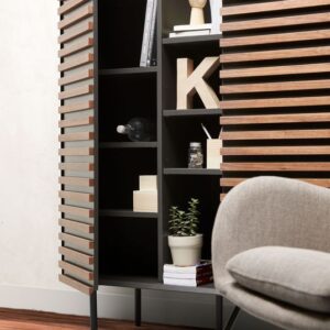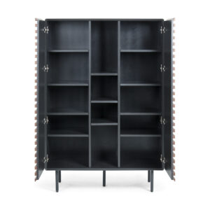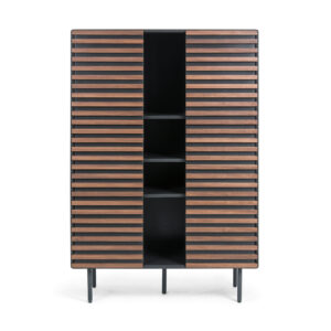 Aparador con estructura en DM lacado grafito mate. Frontal con 2 puertas en chapa de nogal, pies de metal.