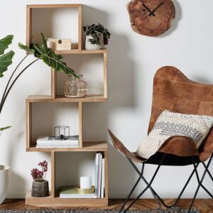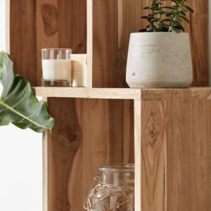 • Estantería de 4 estantes cuadrados, colocados uno encima de otro con un diseño zig-zag, hechos de madera maciza de teca.