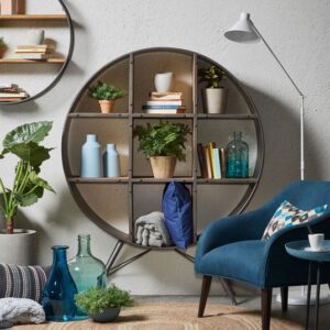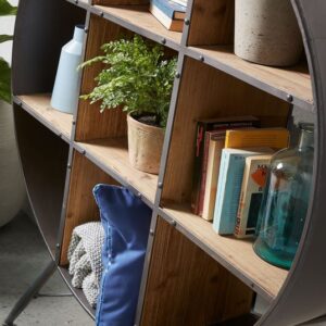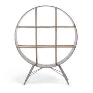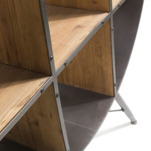 Estantería redonda con estructura de metal y estantes de madera de abeto.