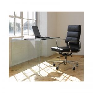 Mesa de diseño fabricada integramente de cristal templado curvado con acabado transparente y 12 mm. de espesor.
