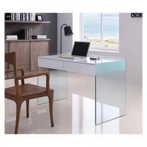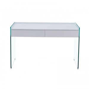 Mesa escritorio de diseño con dos prácticos cajones, sobre lacado en blanco brillo y laterales de cristal templado.