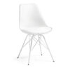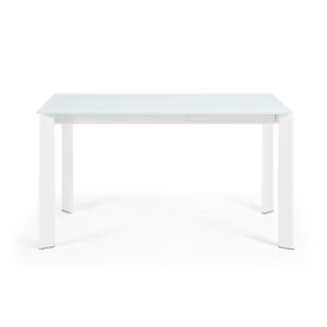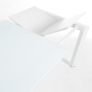 Mesa extensible con estructura de acero pintado en epoxi blanco y sobre en cristal templado. Longitud máxima 220 cm.