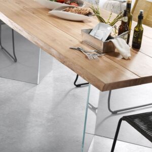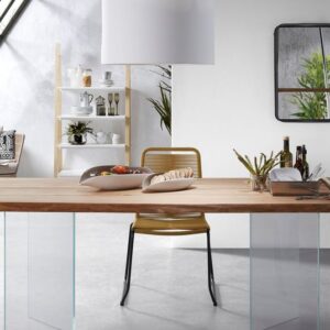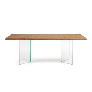 Mesa fija con pies de cristal templado y sobre de madera maciza de roble con un acabado encerado natural.