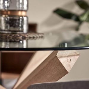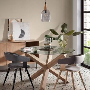 Mesa redonda con tapa redonda de cristal templado. Los pies están fabricados con madera maciza de roble.