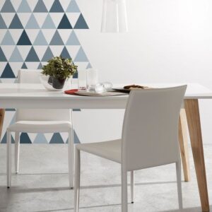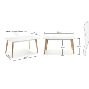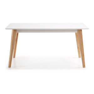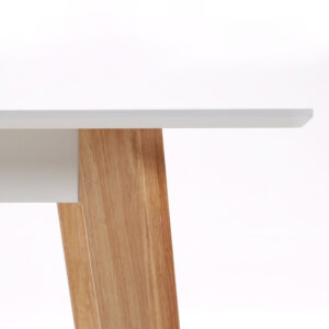 Mesa fija con sobre de DM lacado blanco mate. Patas, en madera de roble natural macizo.