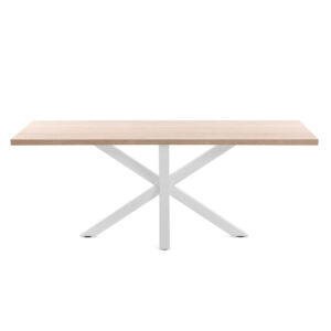 Mesa fija rectangular con sobre melaminizado simil roble y con patas de acero color blanco y forma cruzada.