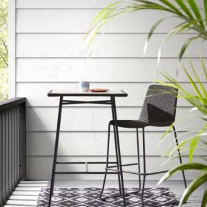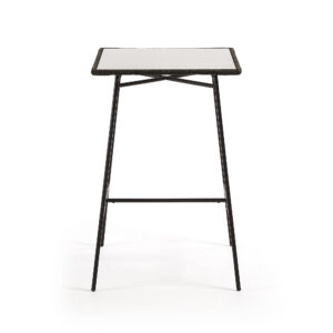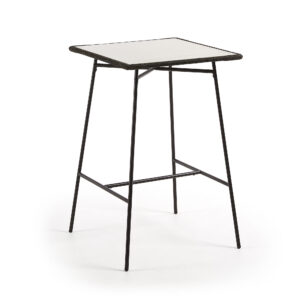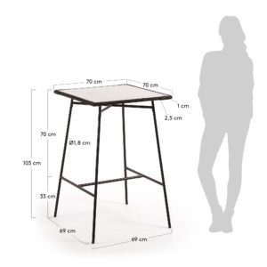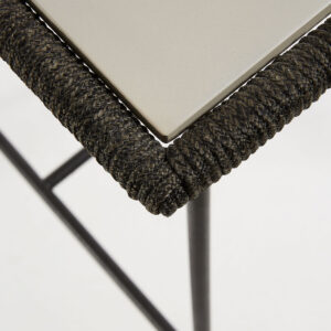 Mesa alta con 103 cm, de uso en interior o exterior bajo cubierta. Sobre de cemento enmarcado de cuerda marrón y estructura en acero galvanizado