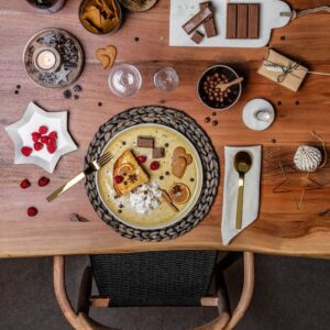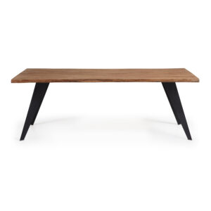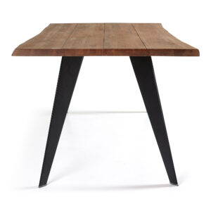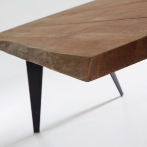 Mesa fija con sobre de madera maciza de roble de acabado envejecido. Pies en acero pintado en epoxy negro.