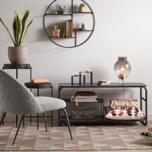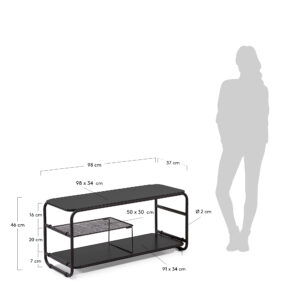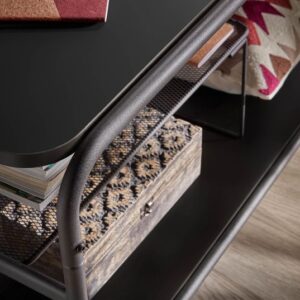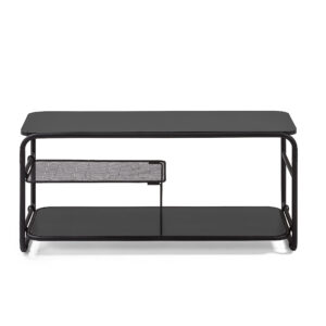 Mueble de televisión en color negro con estructura de acero. La tapa y el estante inferior están confeccionados con tablero de partículas laminado.