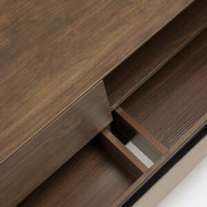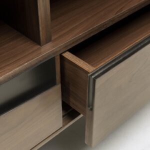 El mueble para televisión City, de 3 cajones y 2 huecos, está hecho con un tablero chapado en nogal americano.