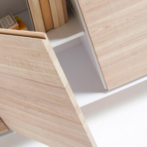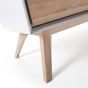 Aparador con puertas y pies de madera de fresno. Estructura en tablero de fibra de madera lacado blanco mate.