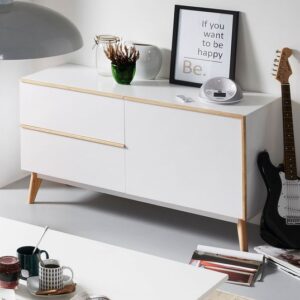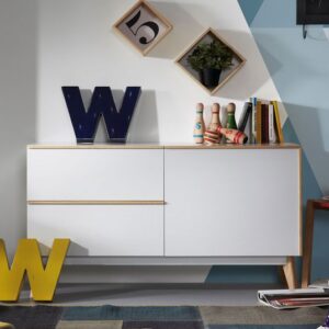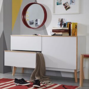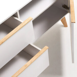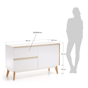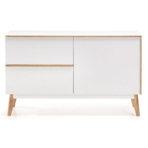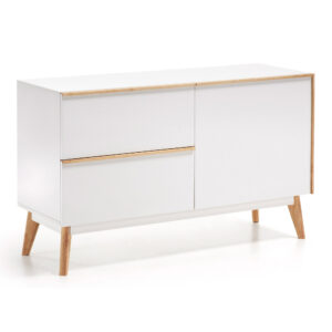 Aparador con un armario y dos cajones en DM lacado mate. Patas, tiradores y marco en madera de caucho macizo.