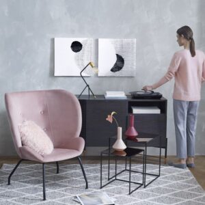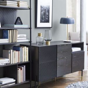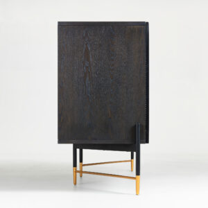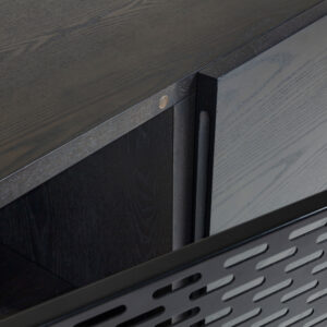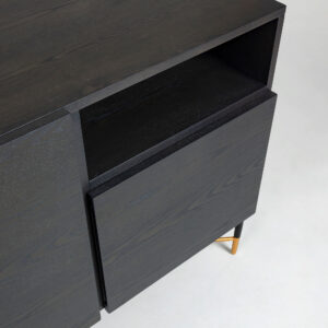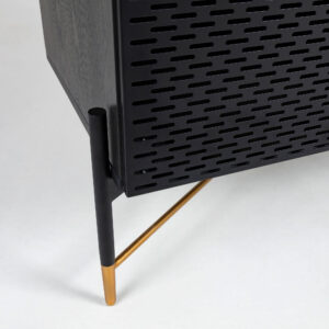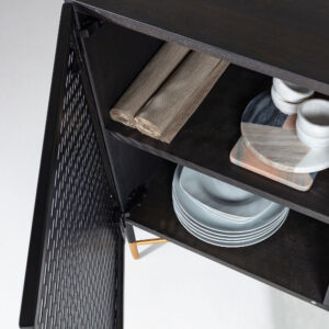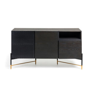 Aparador con estructura en chapa de fresno acabado ceniza. 2 puertas en fresno chapado y 1 puerta con rejilla metálica. Patas en metal con detalles en pintura dorada.