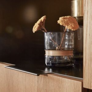 Estantería moderna de estilo nórdico con estructura en DM lacado negro mate. Frontal en chapa de roble. Patas y tiradores de metal negro.