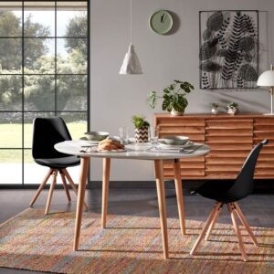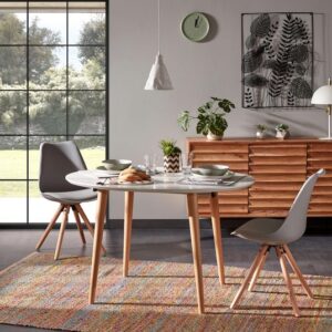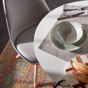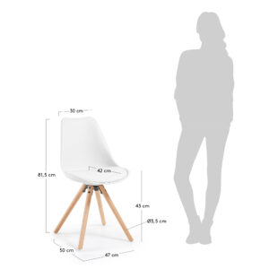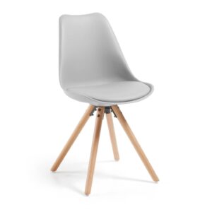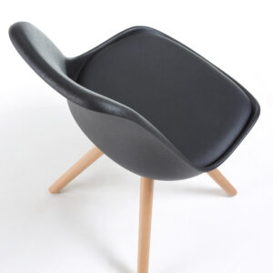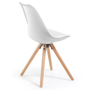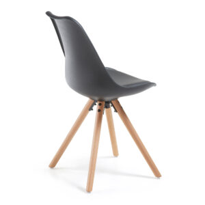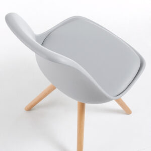 La silla Asper, con su asiento de polipropileno tapizado y patas de madera de haya natural en forma de trípode, cuenta con los mejores acabados.