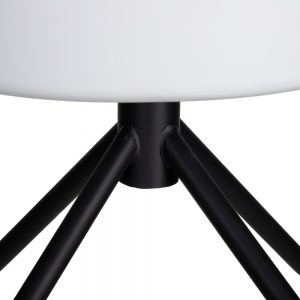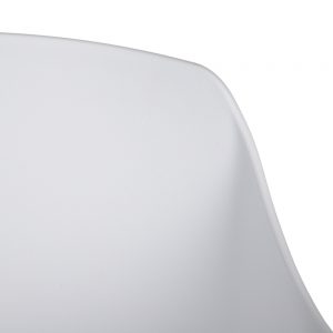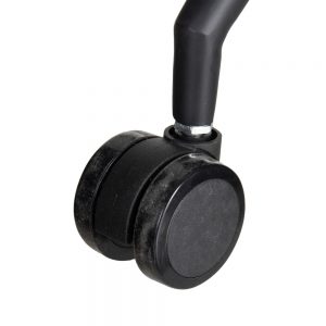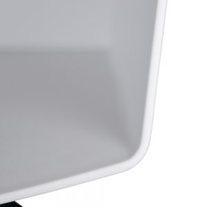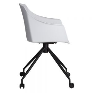 Silla con carcasa de polipropileno blanco y estructura piramidal con ruedas de metal negro.