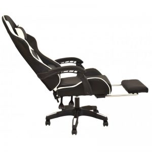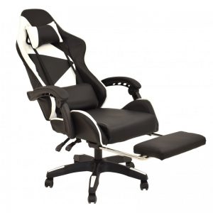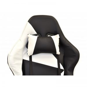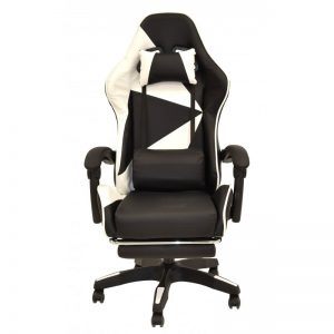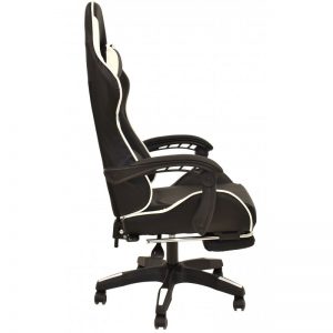 Sillón racing, respaldo alto, elevación a gas, mecanismo de sincronización, tapizado combi similpiel negra – blanca. Dispone de un original reposapiés.