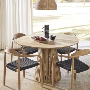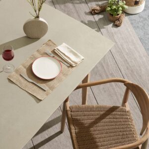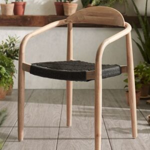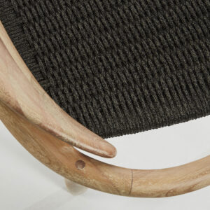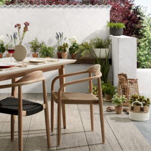 La silla Ipsen está fabricada con madera maciza de eucalipto de color natural. Su asiento está compuesto por un trenzado con cuerda de poliester resistente a los rayos UV, por lo que la silla está preparada para exteriores bajo cubierta.
