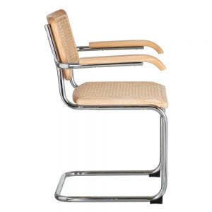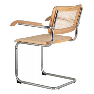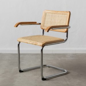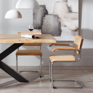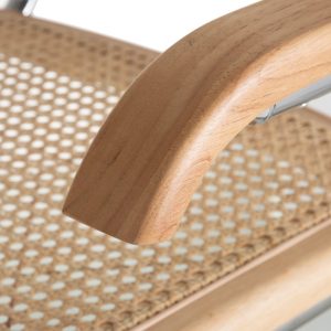 Silla con brazos de estilo contemporáneo con asiento y respaldo confeccionados de madera maciza y ratán. La estructura es de acero inoxidable.