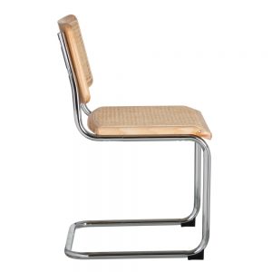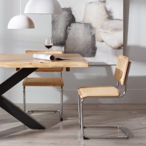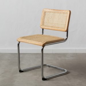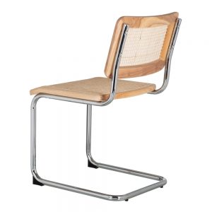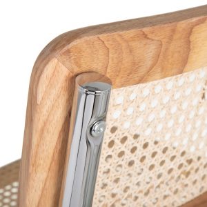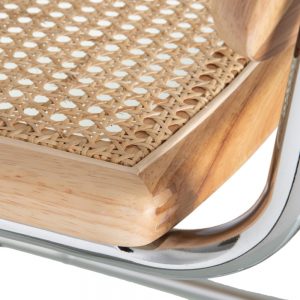 Silla de estilo contemporáneo con asiento y respaldo confeccionados de madera maciza y ratán. La estructura es de acero inoxidable.