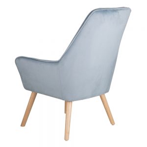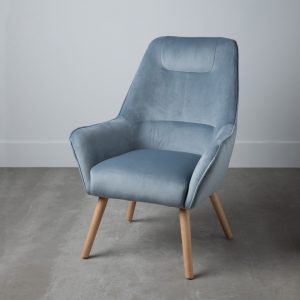 Sillón tapizado en terciopelo azul claro de estilo nórdico. Te aportará una suave y envolvente sentada.