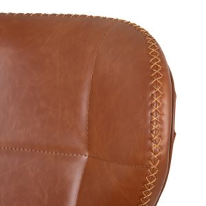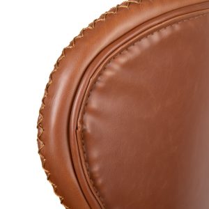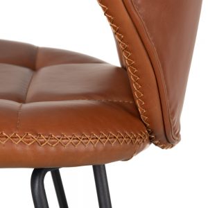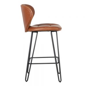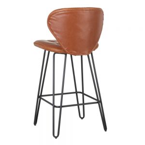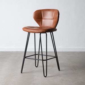 Taburete de estilo retro tapizado en símil piel camel y la estructura metálica de las patas es negra.