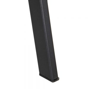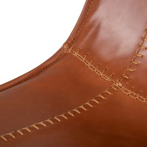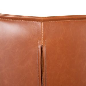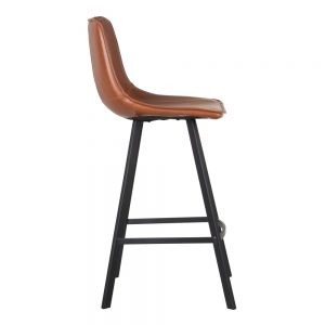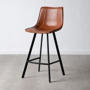 Taburete de estilo industrial tapizado en símil piel camel y patas de metal negro.