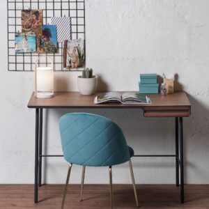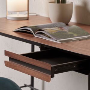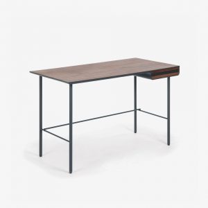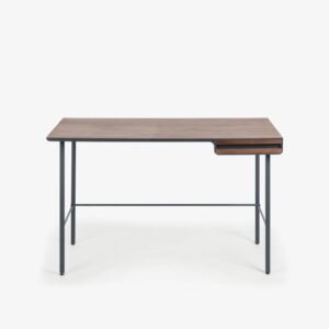 Escritorio en chapa de nogal y DM lacado grafito mate. Frontal con cajón en chapa de nogal, pies de metal.