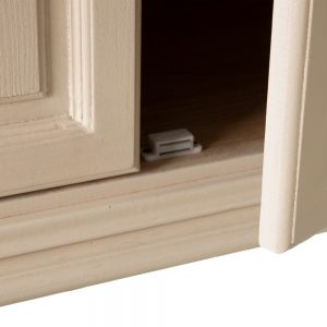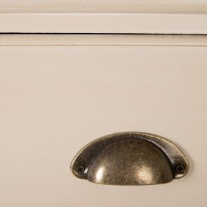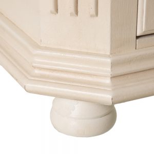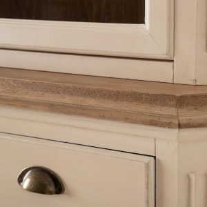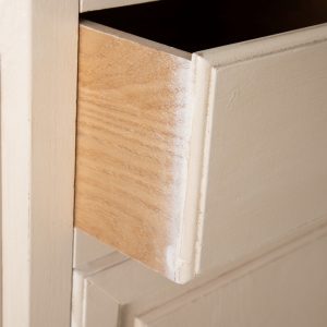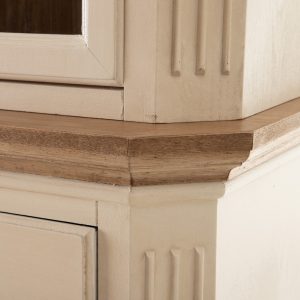 Vitrina de madera maciza de paulonia y DM con estilo vintage. Original combinación del acabado envejecido crema y el mallado de la madera.