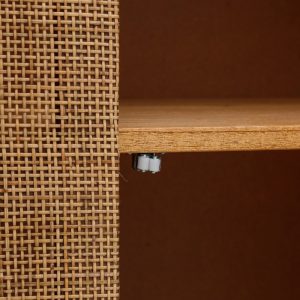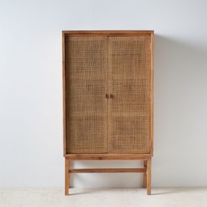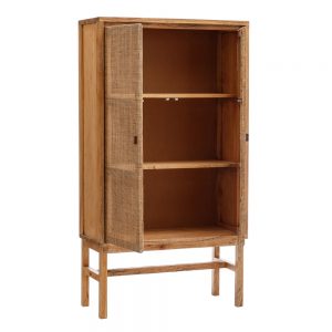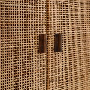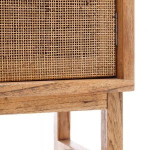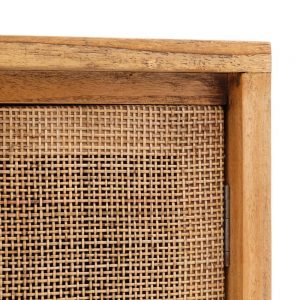Vitrina de madera maciza de mindi con acabado miel. Atemporal de estilo étnico colonial con 2 puertas de ratán natural.